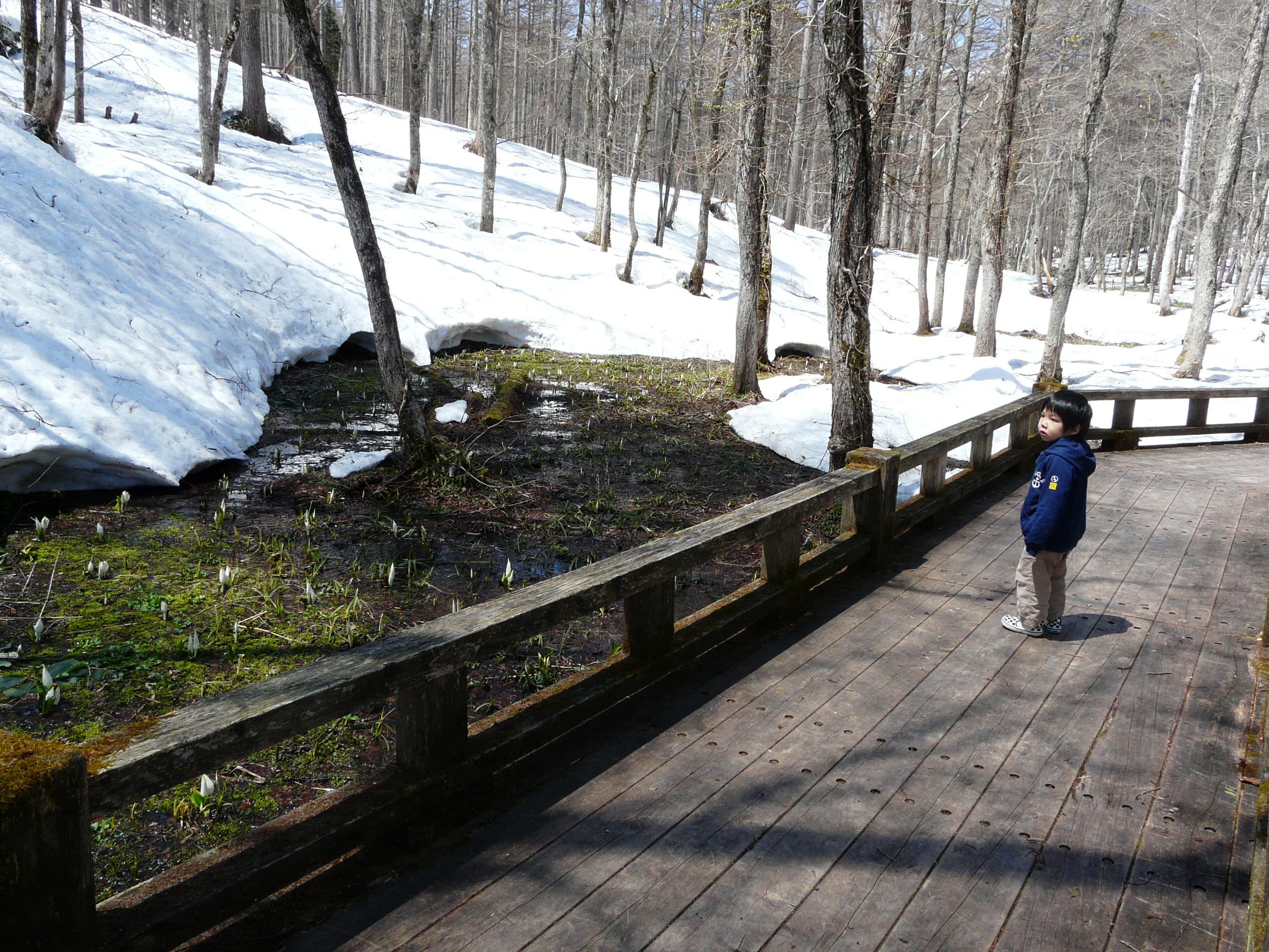 ここは森林植物園の湿地。雪解けの湿地に水芭蕉がちょこちょこ。